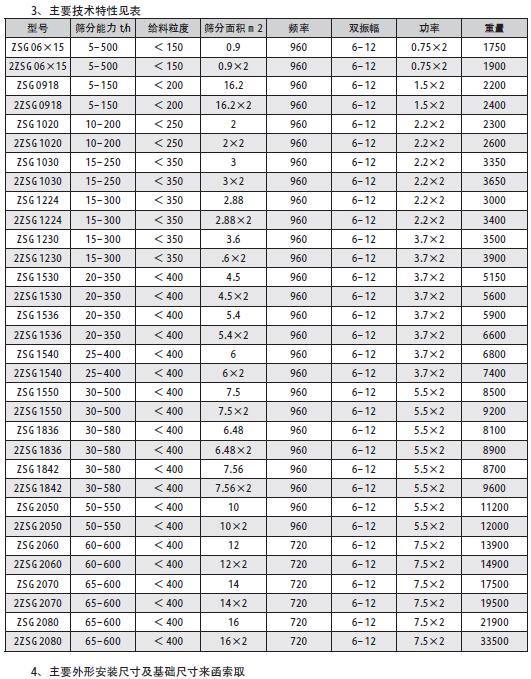 1、型號編制說明:2、ZSG系列高效重型振動篩的分類及用途:
